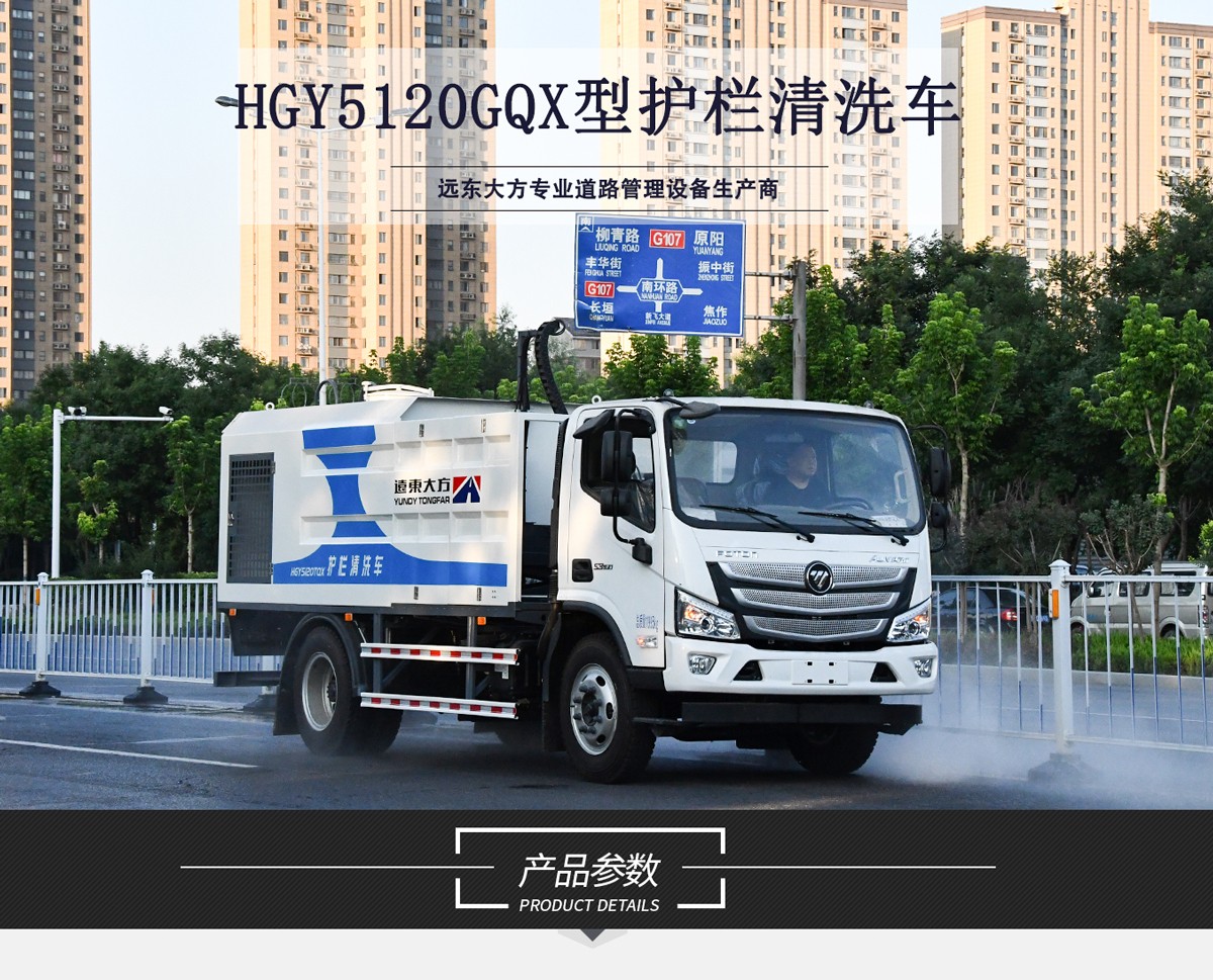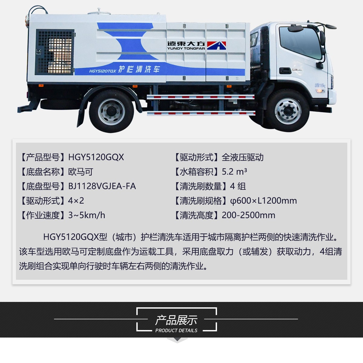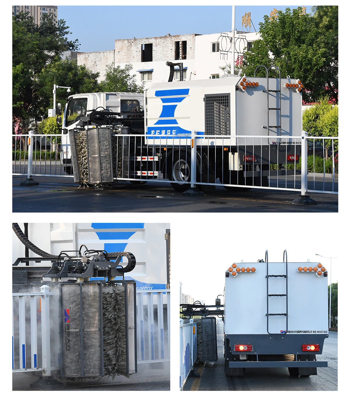 HGY5120GQX型(城市)護欄清洗車適用于城市隔離護欄兩側(cè)的快速清洗作業(yè)。該車型選用歐馬可定制底盤,全液壓驅(qū)動,多組清洗刷組合實現(xiàn)單向行駛時車輛左右兩側(cè)的清洗作業(yè)。